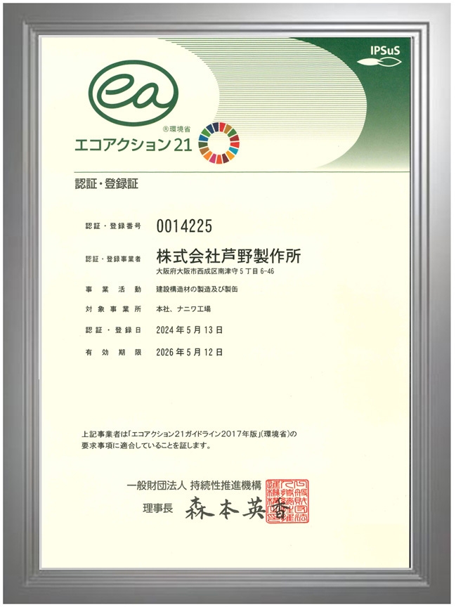 大阪市西成区に本社を構える株式会社芦野製作所は、橋梁の補修・補強に必要な構造物の製造を通じて地域インフラの安全性向上に貢献してきました。2025年8月、同社は環境・社会・ガバナンスの各分野における取り組みが評価され、ESGマーク認証(ブロンズ)を取得しました。西成区からのESG認証取得は初めてであり、地域の中小企業としてESGの先進的な取り組みが注目されています。今後も株式会社芦野製作所は、技術力の向上とともに、持続可能な社会の実現に向けた取り組みを継続していく方針です。