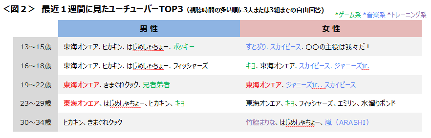 どの年代も知名度の高いユーチューバーが上位に挙がるが、特に1929歳男性と1922歳女性では「東海オンエア」が2位以下を引き離して一強であった。さらに男性では「ポッキー・兄者弟者・キヨ」などのゲーム系チャンネル、女性では「すとぷり・スカイピース・嵐・ジャニーズJr.」といった音楽系や、「竹脇まりな」といったトレーニング系などが上位の回答にあがった。<図2>