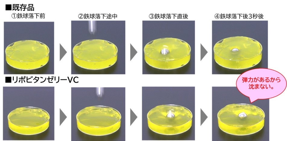 画像をご覧いただくと、当社の既存品では鉄球がゼリーに沈み込むのに対し、「リポビタンゼリーVC」は鉄球を跳ね返し、そのぷるぷる感の強さが一目瞭然です。