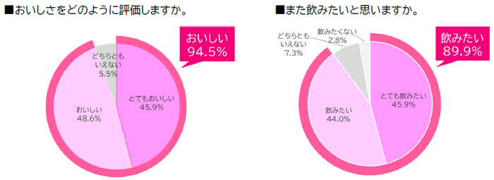 左図:Q 試飲したゼリー飲料のおいしさをどのように評価しますか。 右図:Q このゼリー飲料をまた飲みたいと思いますか。