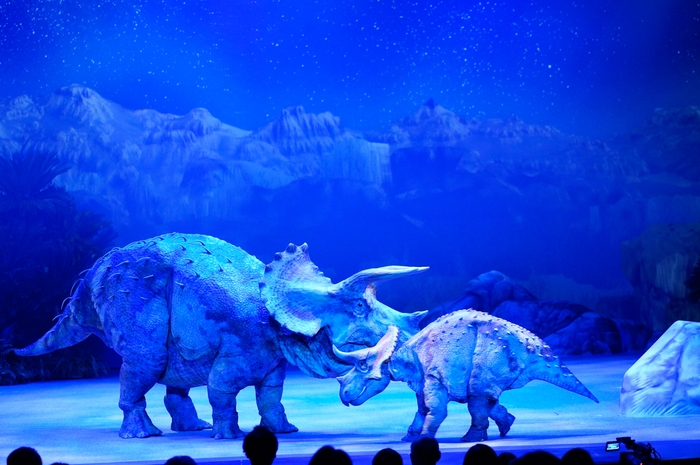 さて、物語にはティラノサウルスやトリケラトプスなど15頭以上の恐竜オールスターが登場。劇場の天井につきそうなほど巨大な全長13mを超えるブラキオサウルスも初登場する。目の前にいる恐竜たちのまばたき、呼吸をするたびに動く胸の動き、舌や尻尾の動きなど実際に見ると、そこに生命を感じることができる。客席内に迫り来る恐竜たちに、一瞬の恐怖のあと、なぜか愛着を覚える。それもまた不思議体験である。