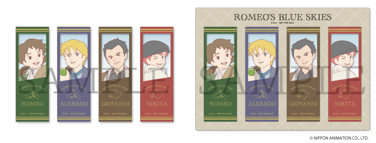 「ロミオの青い空」の関連商品を1,500円(税込)以上お買い上げごとに、先着で「クリアしおり」(全4種)をランダムで1枚プレゼントいたします。デザインは、ロミオ・アルフレド・ジョバンニ・ニキータがデザインされた全4種類です。