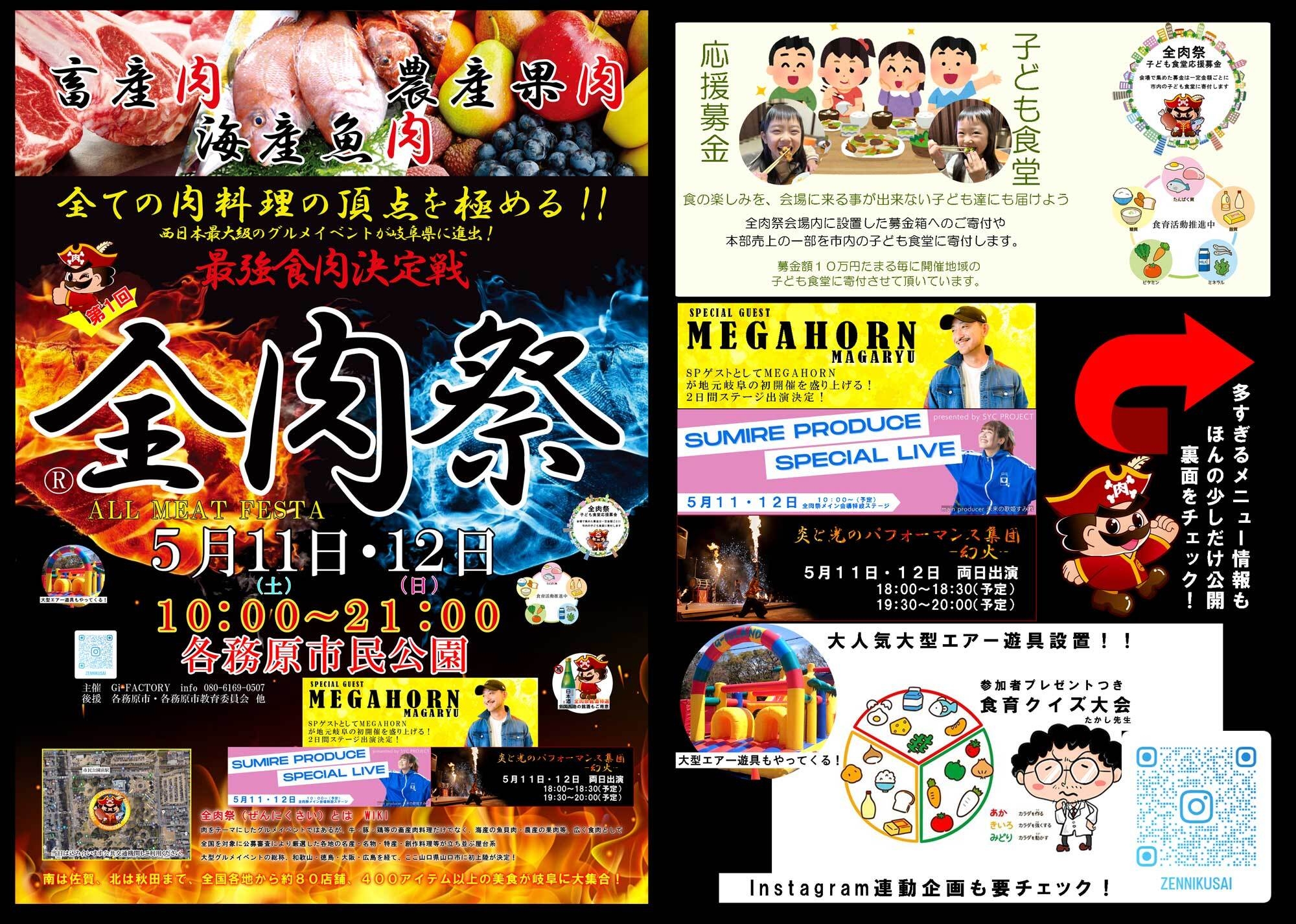 Gi-FACTORYは、和歌山・徳島・大阪・広島・山口・島根・北九州・岡山などで開催している大型野外グルメイベント『全肉祭』を2024年5月11日~5月12日の2日間、岐阜県各務原市にある各務原市民公園にて第1回開催を行います。