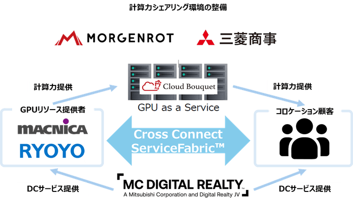 この度開始するサービス「AI XCHANGE powered by Cloud Bouquet」は、GPU計算力を必要とする企業と、GPU計算力を保有する事業者をマッチングする、モルゲンロットによるサービス「Cloud Bouquet™」の仮想化技術を用いて、MCデジタル・リアルティのデータセンター内にGPUサーバーを保有するマクニカ、菱洋エレクトロのGPU計算力リソースを、モルゲンロット・三菱商事がサービス基盤を整備した上で、MCデジタル・リアルティのお客様向けに1枚・1時間単位から提供するサービスです。