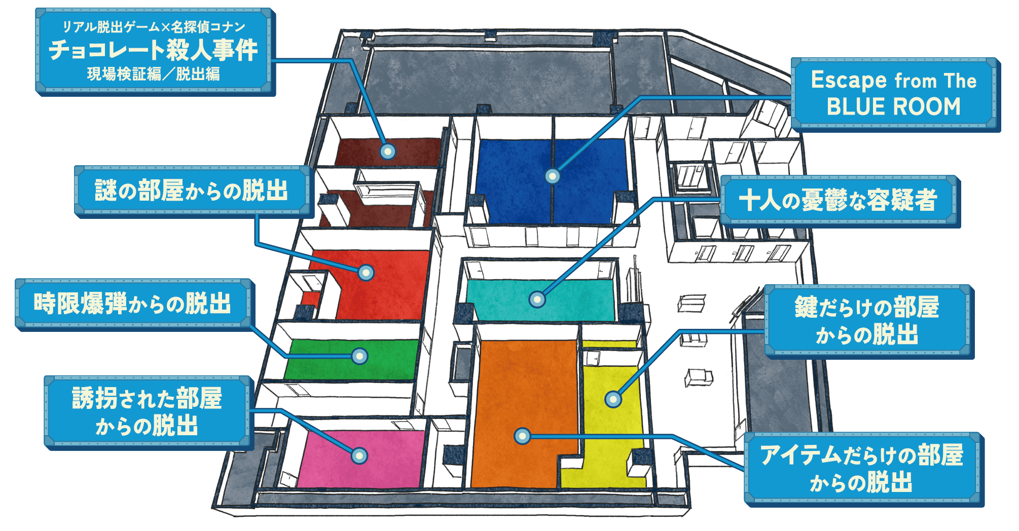 グランドオープン後の2025年1月30日(木)からは、「名探偵コナン」とリアル脱出ゲームがコラボレーションした「コナン脱出」の中でも、多くの方にお楽しみいただいた『チョコレート殺人事件』の現場検証編と脱出編が、装いも新たにラインナップ。また、目の前で膨らみ続ける風船爆弾の解除を目指す『時限爆弾からの脱出』、目隠しと手錠をされ誘拐体験ができる『誘拐された部屋からの脱出』と、バラエティ豊かなテーマのイベントが続きます。