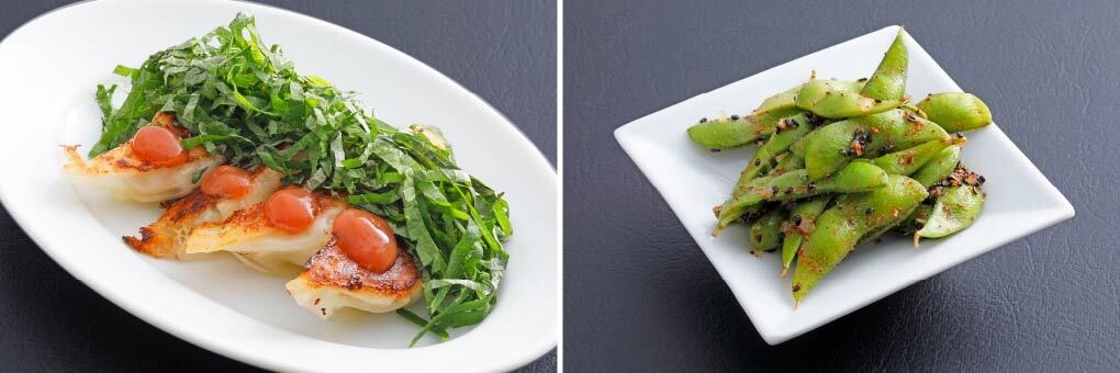 細切りの大葉に梅肉を添えたさっぱりとしたヴィーガン餃子。