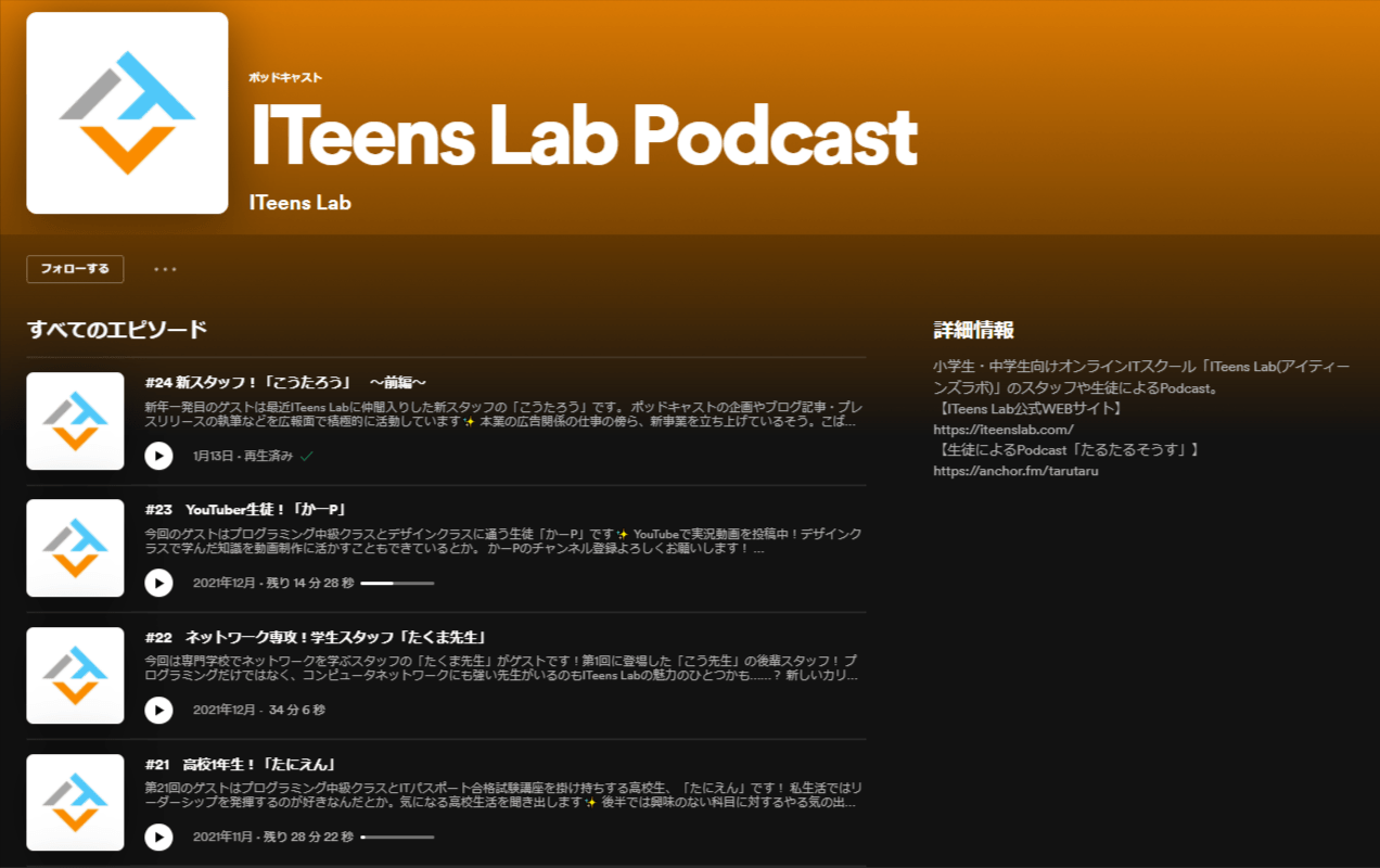 そして、このPodcastは出演してくれているゲストと一緒に作り上げているものですので、ITeens Labスタッフや生徒、保護者のみなさまありがとうございます!みんな!やったぜ!わーい☆もともとはITeens Labの関係者同士のコミュニケーションツールとして始めた取り組みでしたが、はじめてみると、一般の方にとってもきっと面白いであろうコンテンツも揃ってきました。