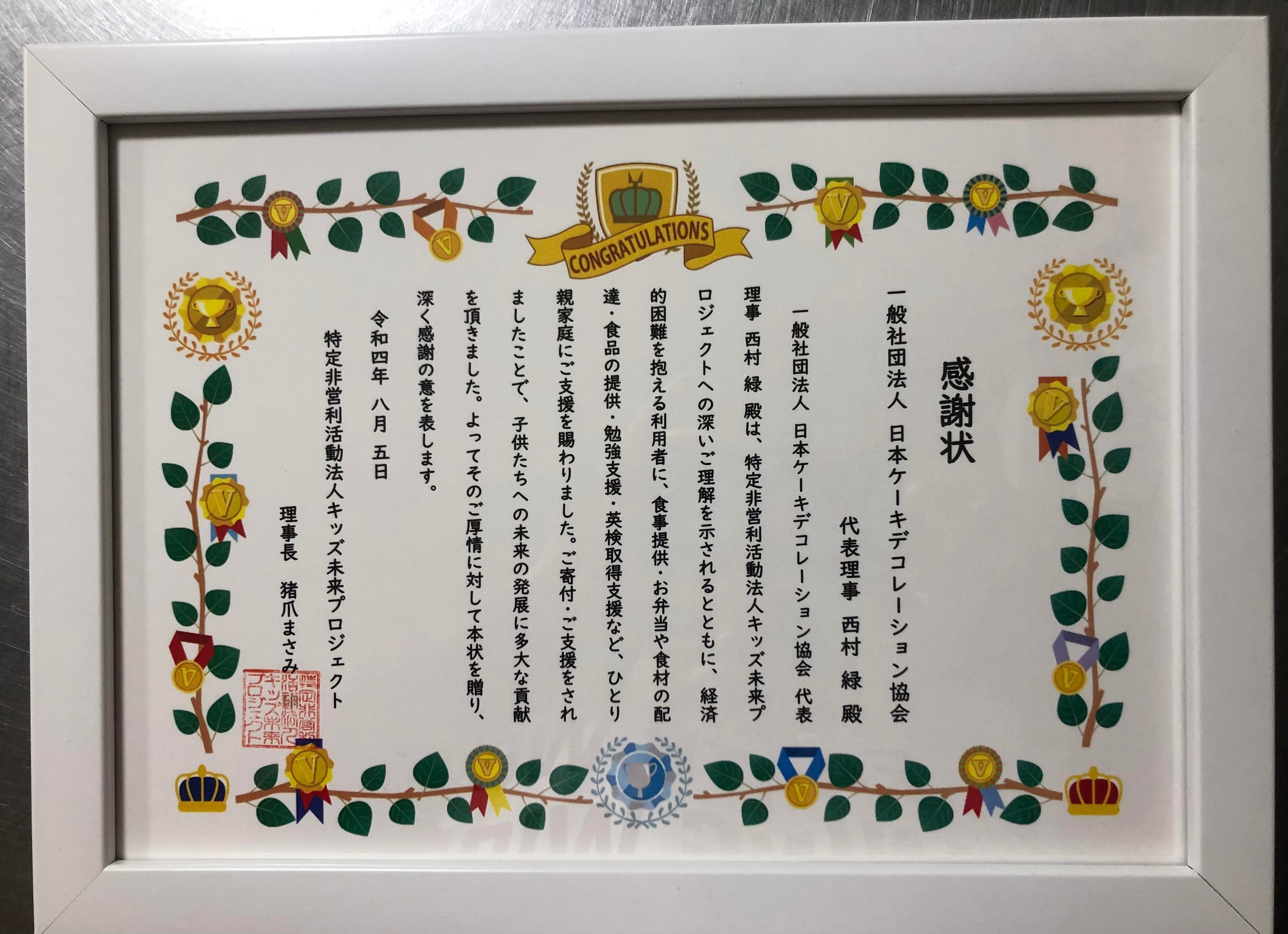 特定非営利活動法人キッズ未来プロジェクト様より、初年度以上にケーキを前にした子どもたちの笑顔が溢れるたくさんのお写真に加え、当協会宛の感謝状まで頂きました。