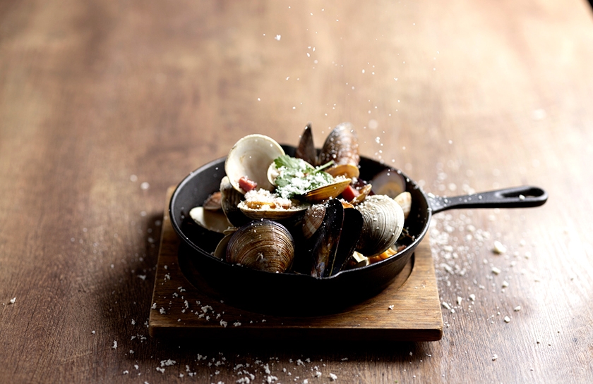 削っていくうちに残ってしまう、ラクレットチーズの“端っこ”を再利用した、当店オリジナルSDGsメニュー。新鮮な旬の貝をたっぷり使用した「貝蒸し」の上から、ラクレットチーズを好きなだけトッピングいたします。味付けは、アンチョビバター風味かクラムチャウダー風味の2種類からセレクト。濃厚な味わいでワインとの相性もバツグンです。