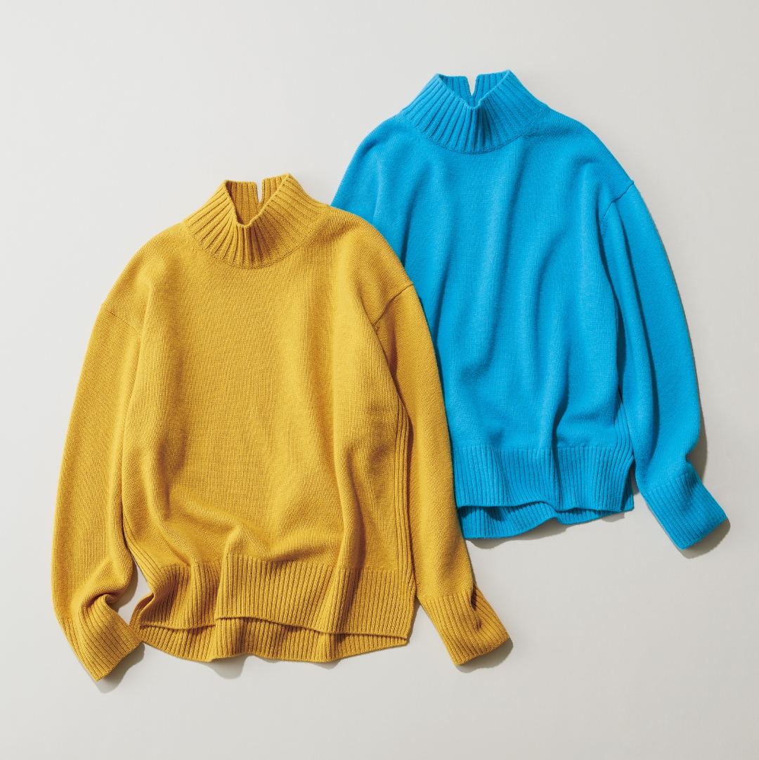 ここ最近、カラフルな色を身につけることが多くて。子供が遠くから見てもわかりやすいようにということもあるのですが、色がくれる力というか、元気になったり、気持ちまで明るくなったりする気がしているんです。ニットというお話を頂いたときに「何かカラフルなものがいいです」とご提案させていただいて。色の見本を見せていただいたり、実際の大きさで作っていただいたりして何色か比べてみる中で、静と動、両方いけるカラフルさというか、大人っぽくシックにもできるし、活発に明るく着こなすこともできる2色です。黄色はピカピカではなくて、少し落ち着いているけれども、暗すぎない色。ブルーの方は、目が覚めるようなハッとした色合いでもあれば、少し落ち着いている、二つのニュアンスが組み合わさった、2色それぞれの魅力があるかなと感じています。デニムだったり、パンツスタイルでサラッと着ることもできるし、スカートに合わせたりとか、ボトムスはワイドでもタイトでも、両方素敵かなと思います。