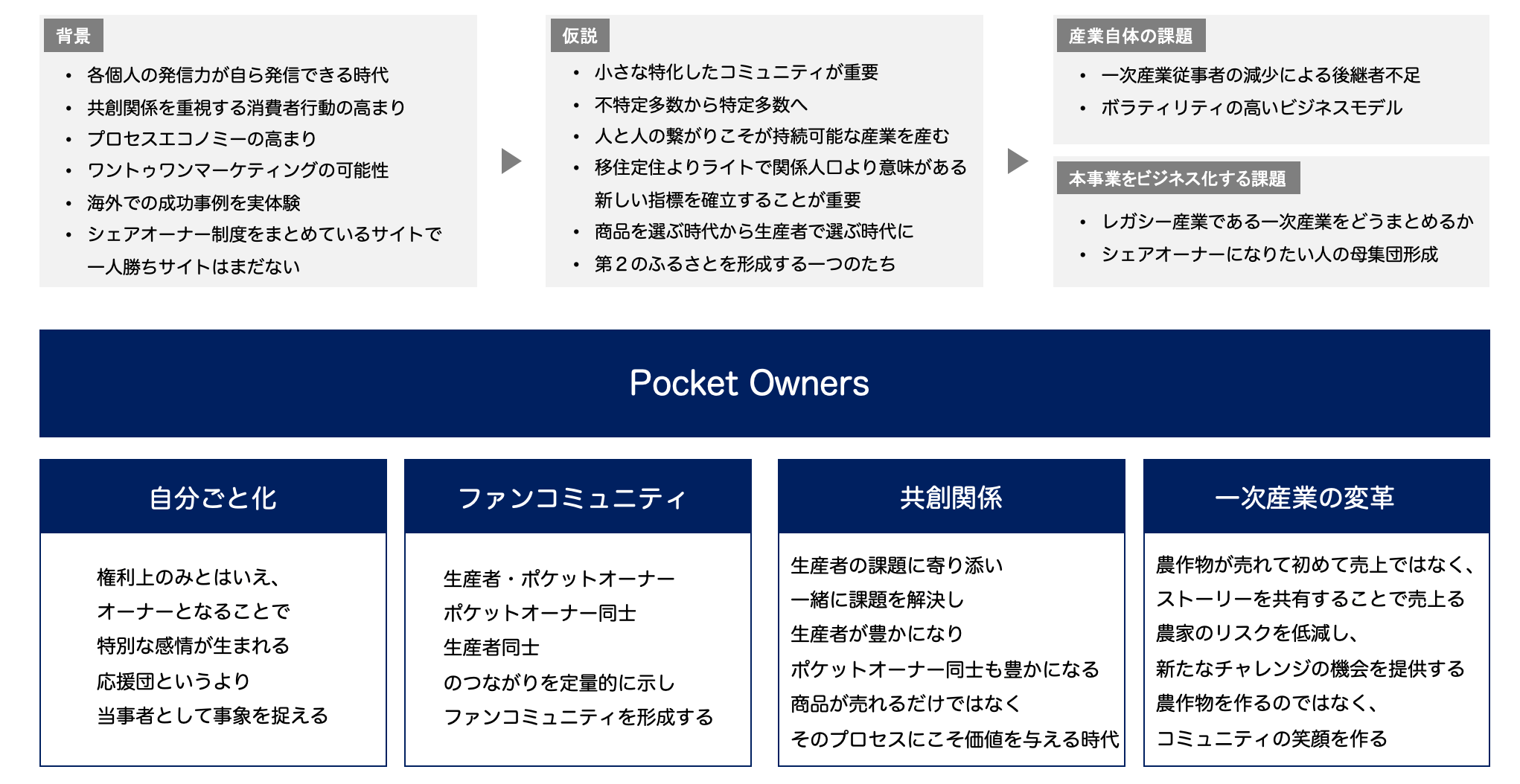 Pocket Ownersでは、生産者や同じ志を持つ仲間と繋がった「オーナー」同士が、ファンコミュニティを作り共創関係を築くことで、「その地域の一員として」生産者を継続的に支援。さらに、所属する小さなコミュニティ同士を繋げてゆき、一次産業や二次産業への新しい関わり方により、地方の活性化も進める計画です。