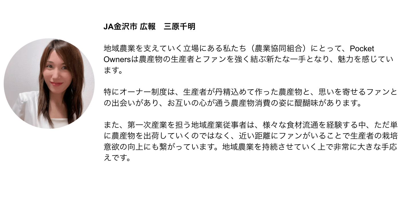 Pocket Owners(ポケット・オーナーズ)は、日本各地の生産物(農産物、水産品、畜産物、加工品、伝統工芸品など)に関して、特定期間の権利上のオーナーになることで、ここでしか得られない様々な特典・体験を得られるサービスです。