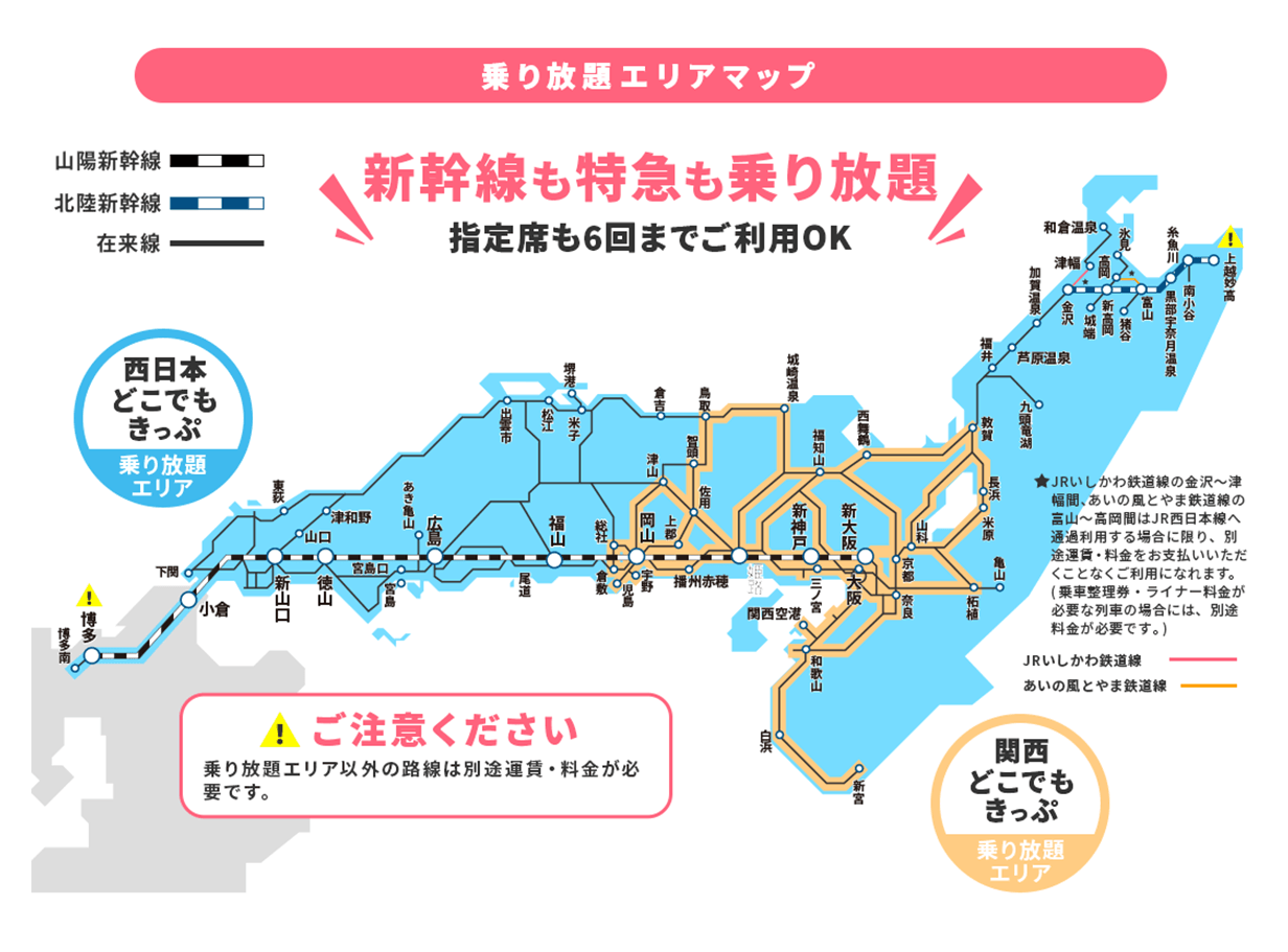 なお、指定席が利用できるのは最大6回までだが、自由席なら利用回数の制限はない。一方、米原―新大阪の東海道新幹線、サンライズ瀬戸・出雲のノビノビ座席、WEST EXPRESS銀河は利用できない。