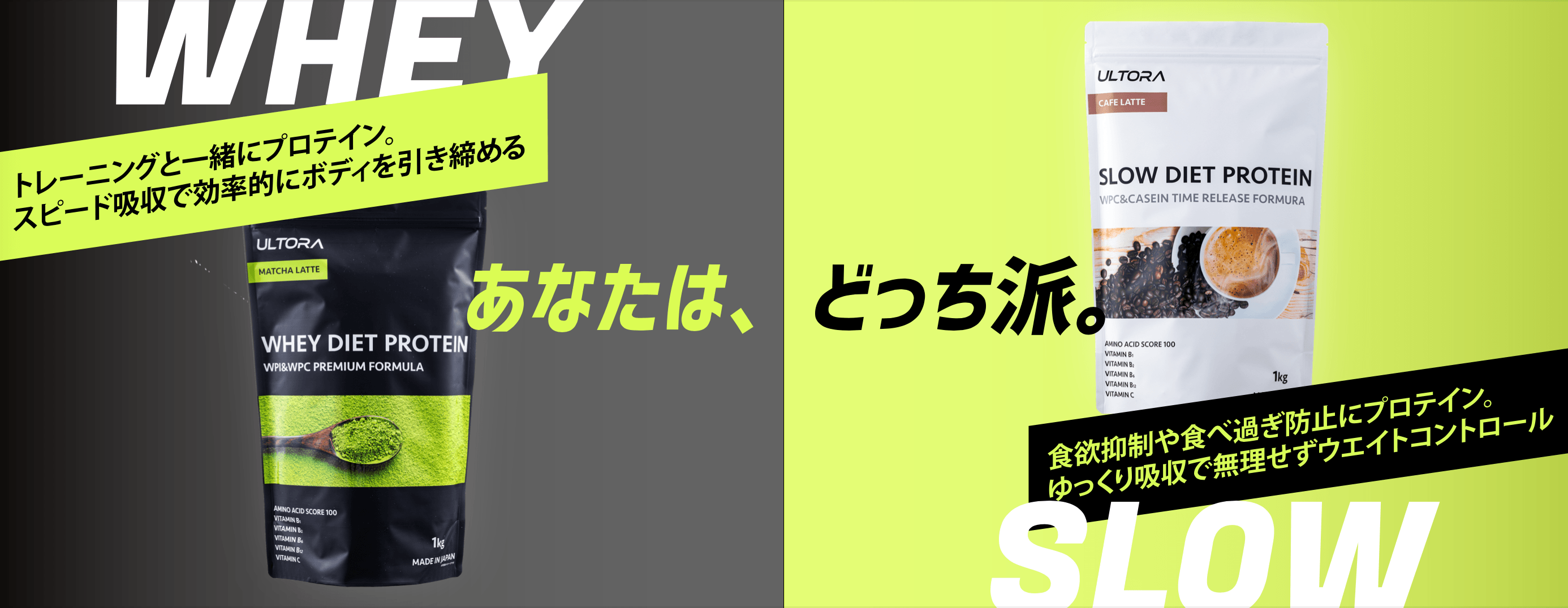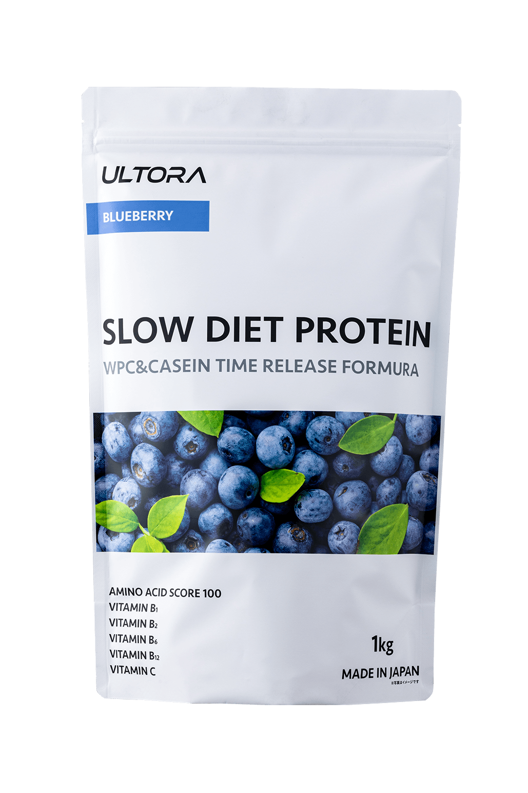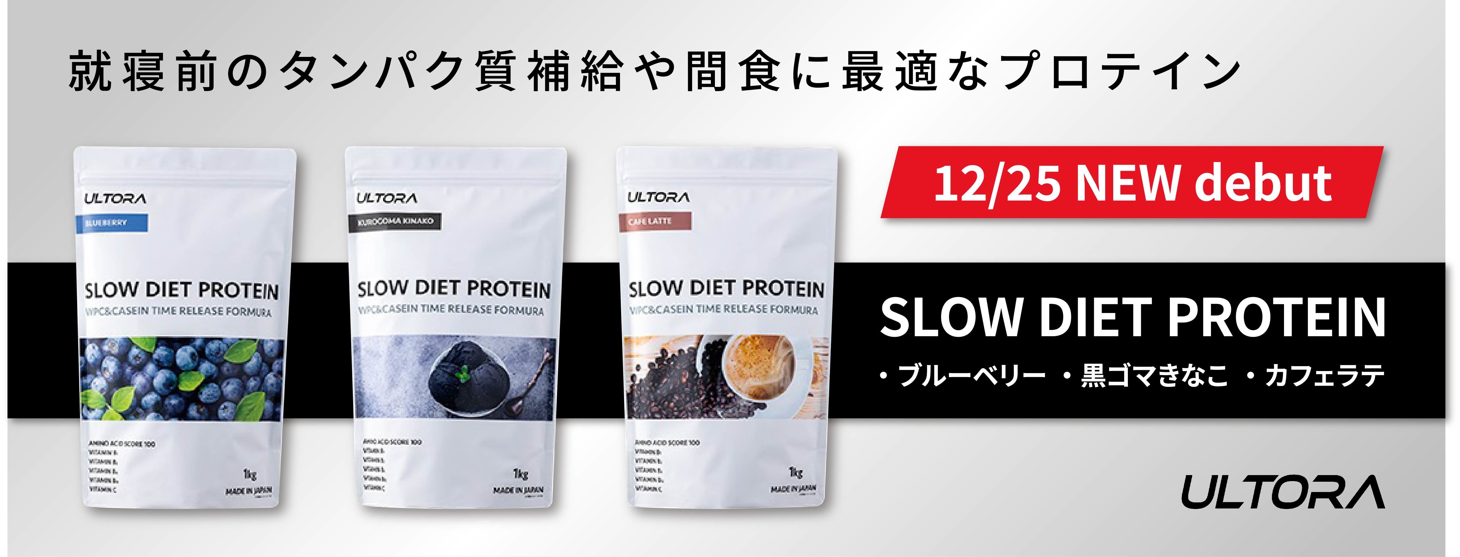 また、吸収の早いホエイプロテインと吸収の遅いカゼインプロテインをブレンドし、更に水溶性食物繊維を配合させることにより、日常的なタンパク質補給として飲むのはもちろんのこと、減量中の空腹感を抑制させる効果も期待出来る万能型のタイムリリースプロテイン【ULTORA スローダイエットプロテイン】も発売いたしました。フレーバーは、<黒ゴマきなこ風味><カフェラテ風味><ブルーベリー風味>の3種類です。