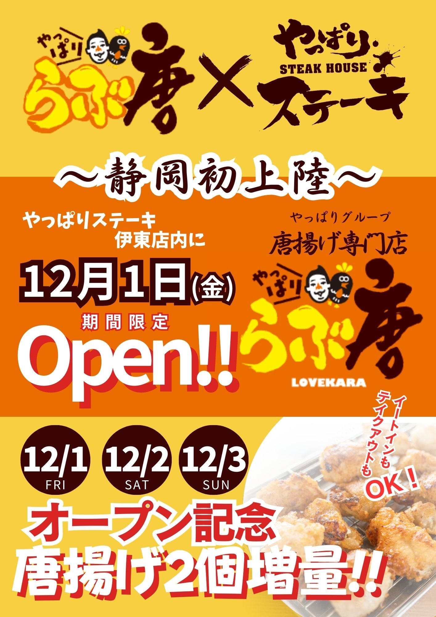 株式会社北海物産(代表取締役:岡田 道男)は、2022年4月に静岡県伊東市にオープンした「沖縄発ステーキ食堂のやっぱりステーキ」店内にて、2023年12月1日(金)より唐揚げ専門店『らぶ唐』の提供・販売をスタートいたします。