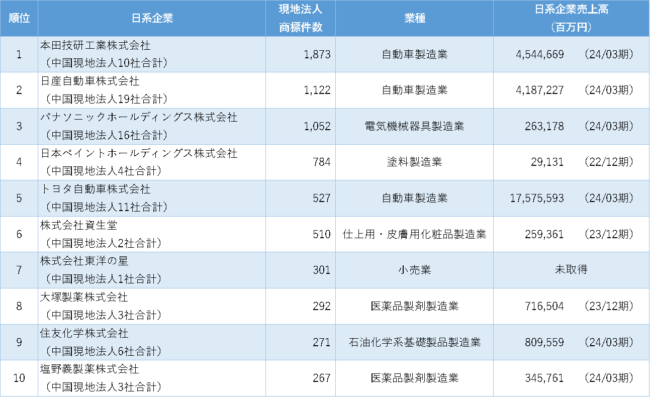 今回の「中国日系企業の商標保有数ランキング」では、1位が本田技研工業(商標保有数1,873件)、2位が日産自動車(同1,122件)、3位がパナソニックホールディングス(同1,052件)という結果になりました。