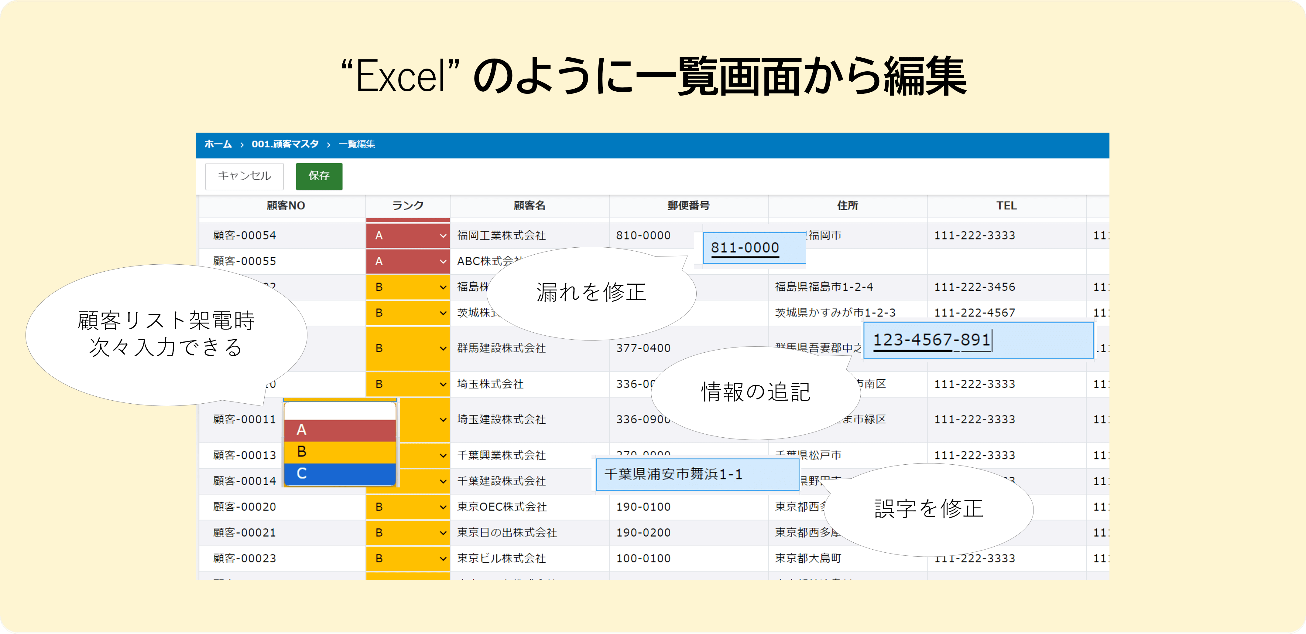 Excel感覚で、一覧画面上から変更したい項目を直接編集できるので、ストレスなく編集作業を行えます。