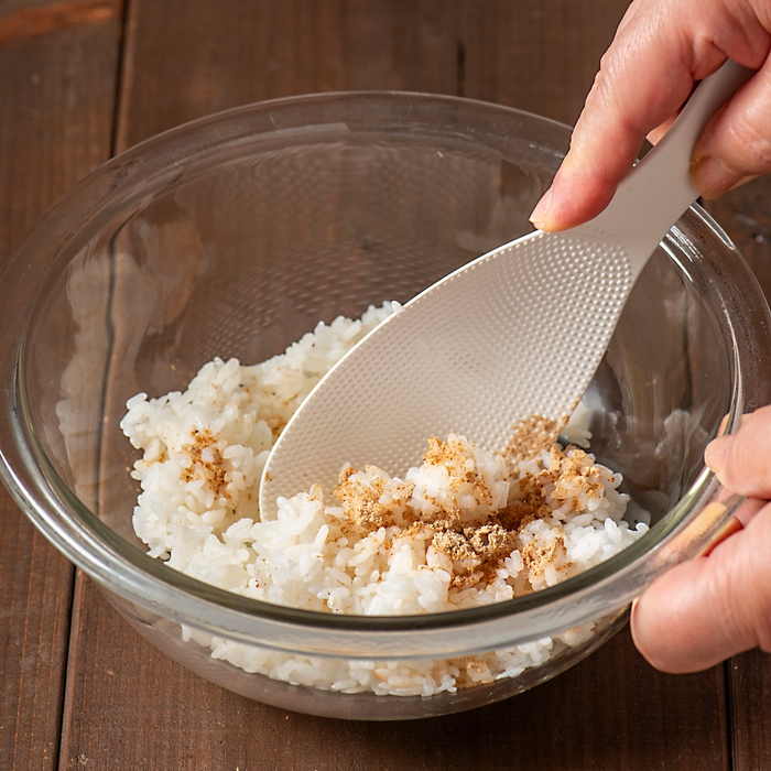 袖山さん:具材もいいけど、粉末だしでご飯の下味をつけるとおにぎりが簡単に美味しくなります。作ってみましょうか!ここにあるご飯は大体1合半。ここに粉末だしが小さじ1かもう少し多めに入れて混ぜます。