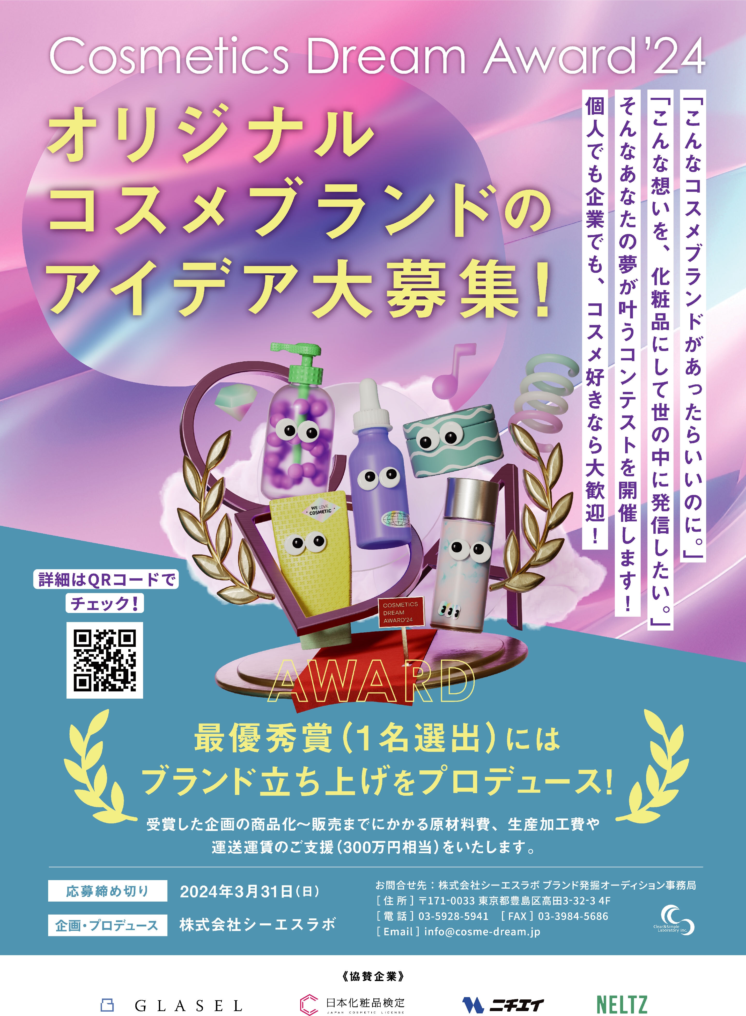 株式会社シーエスラボ(代表取締役:林 雅俊、本社:東京都豊島区、以下 シーエスラボ)は、オリジナル化粧品アイデアを公募し、グランプリに選ばれた方の製品化にかかる費用300万円相当をサポートする『Cosmetics Dream Award'24』への応募を2024年3月31日(日)まで受付しております。