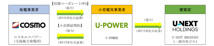 株式会社U-NEXT HOLDINGS(本社:東京都品川区、代表取締役社長CEO:宇野 康秀、以下、U-NEXT HOLDINGS)のグループ会社である株式会社U-POWER(東京都品川区、代表取締役社長:高橋 信太郎、以下、U-POWER)と、コスモエネルギーホールディングス株式会社(本社:東京都港区、代表取締役社長:山田 茂)のグループ会社であるコスモエコパワー株式会社(本社:東京都品川区、代表取締役社長:野地 雅禎、以下、コスモエコパワー)は、再生可能エネルギー由来の電力調達・供給(実質的な供給を含む)についての取り組みを開始したことをお知らせします。
