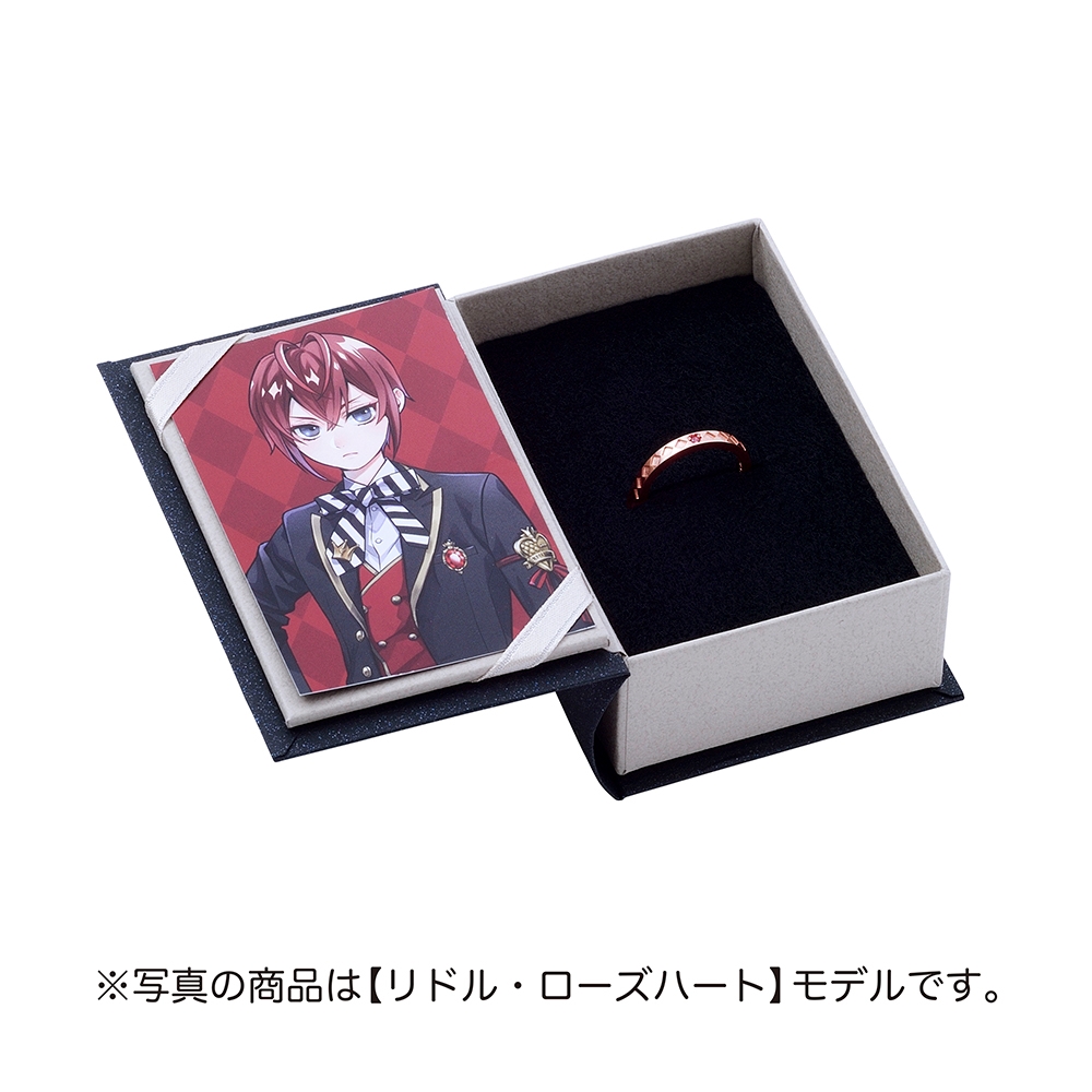 魔法石をイメージしたレッドのストーンをセットしたリングに、ハーツラビュル寮のインスパイア柄を取り込んだストレートフォルムのリングを組み合わせたデザイン。エンドチャームには名前とグルーヴィーキャンディを刻印しました。