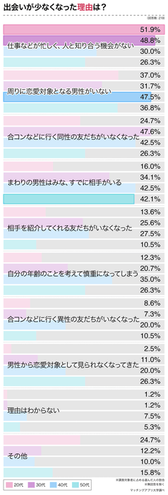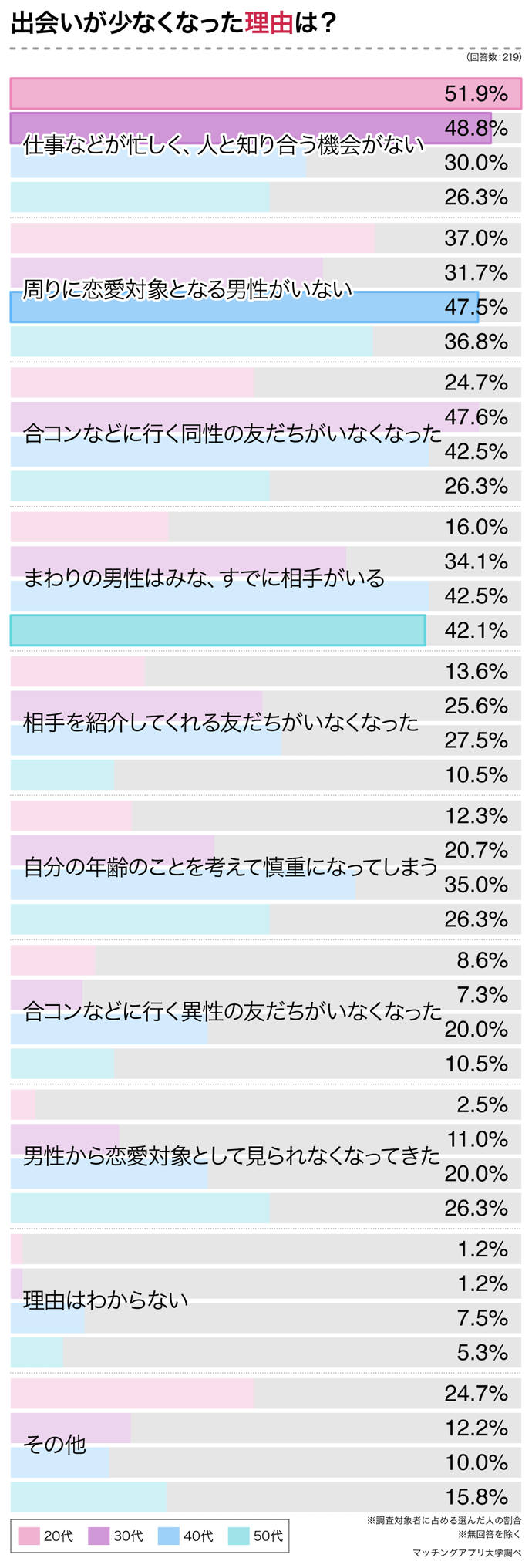 20代・30代では「仕事が忙しい」、40代・50代では「周りに交際できる男性がいない」が出会い減少の要因