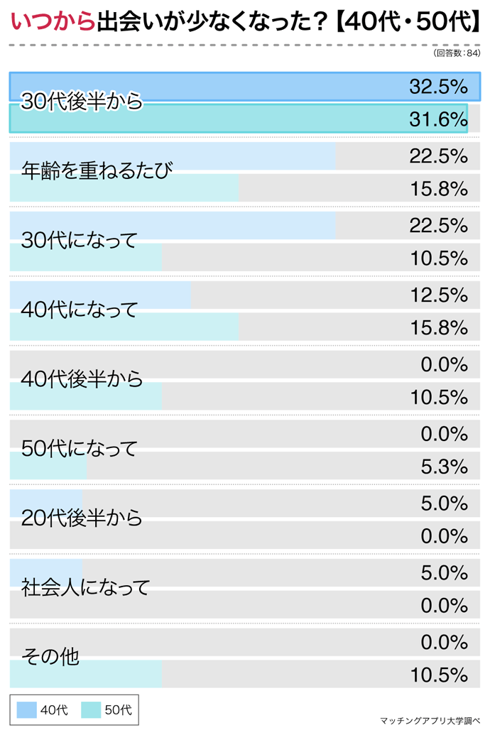 一方で40代・50代では、「30代後半から」出会いが減ったとする意見が最多でした。20代・30代とは異なり生活や環境の変化よりも、年齢が上がったことが“出会いが減った”きっかけだと感じているようです。