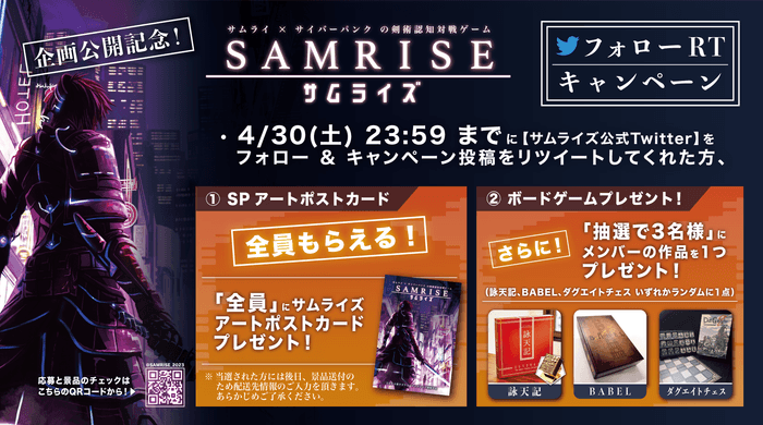 企画公開を記念して、サムライズ公式Twitterアカウントをフォローし、キャンペーン投稿をリツイートしてくれた方全員に、「サムライズ コンセプトアートポストカード」をプレゼントします。さらに、抽選で3名様にクリエイターメンバーの代表作品をランダムで1つプレゼントします。