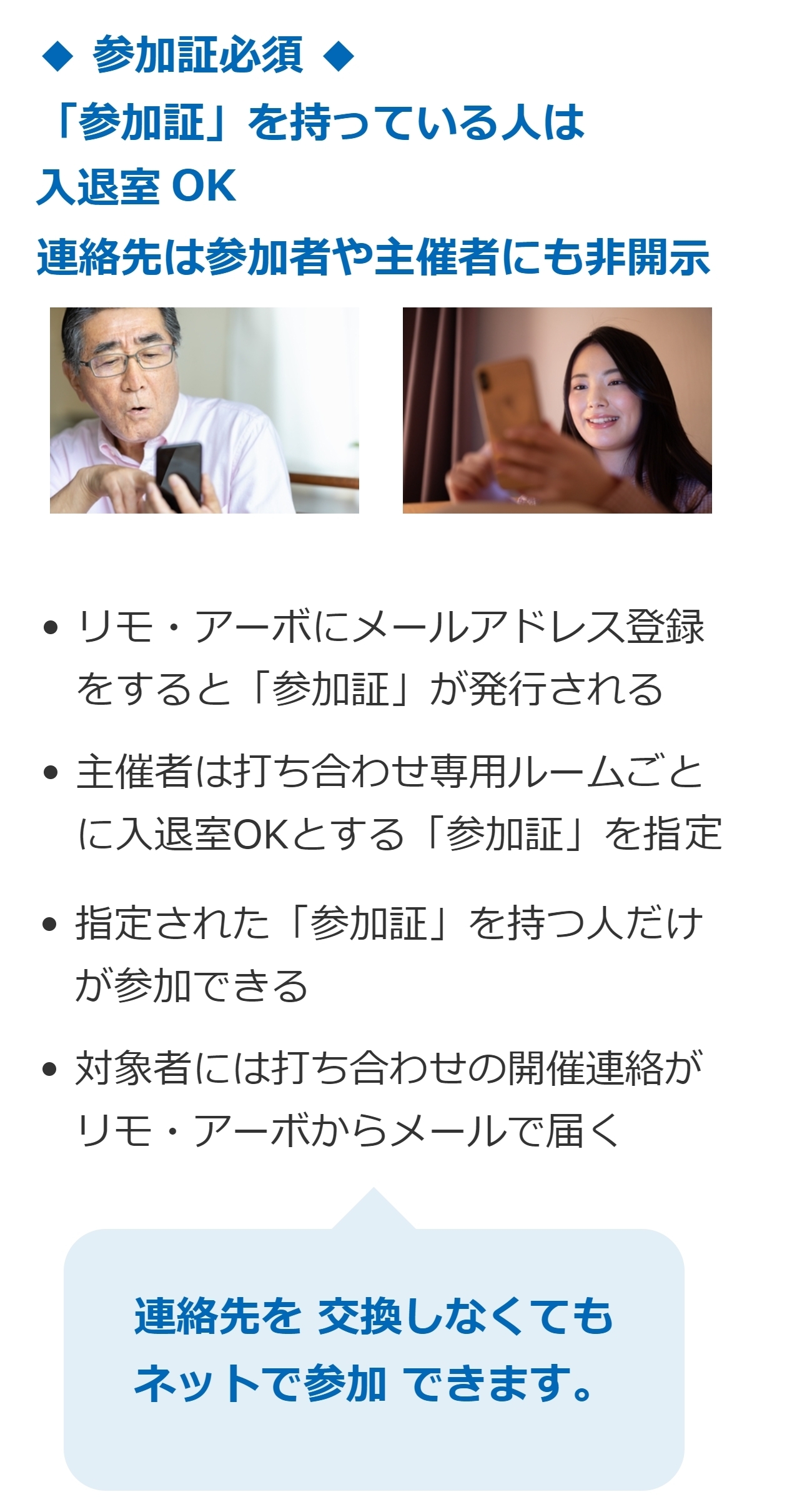 連絡先(メールアドレス)はリモ・アーボが厳密に管理し、主催者や他の参加者には非開示のため、連絡先を交換しなくても打ち合わせに参加できるので、第三者に連絡先が漏れるなどの心配がなく安心して参加できます。