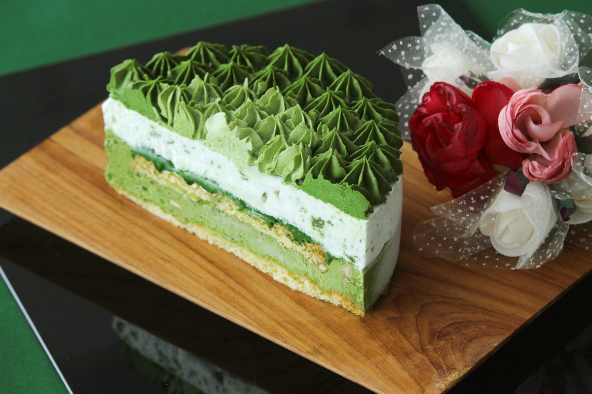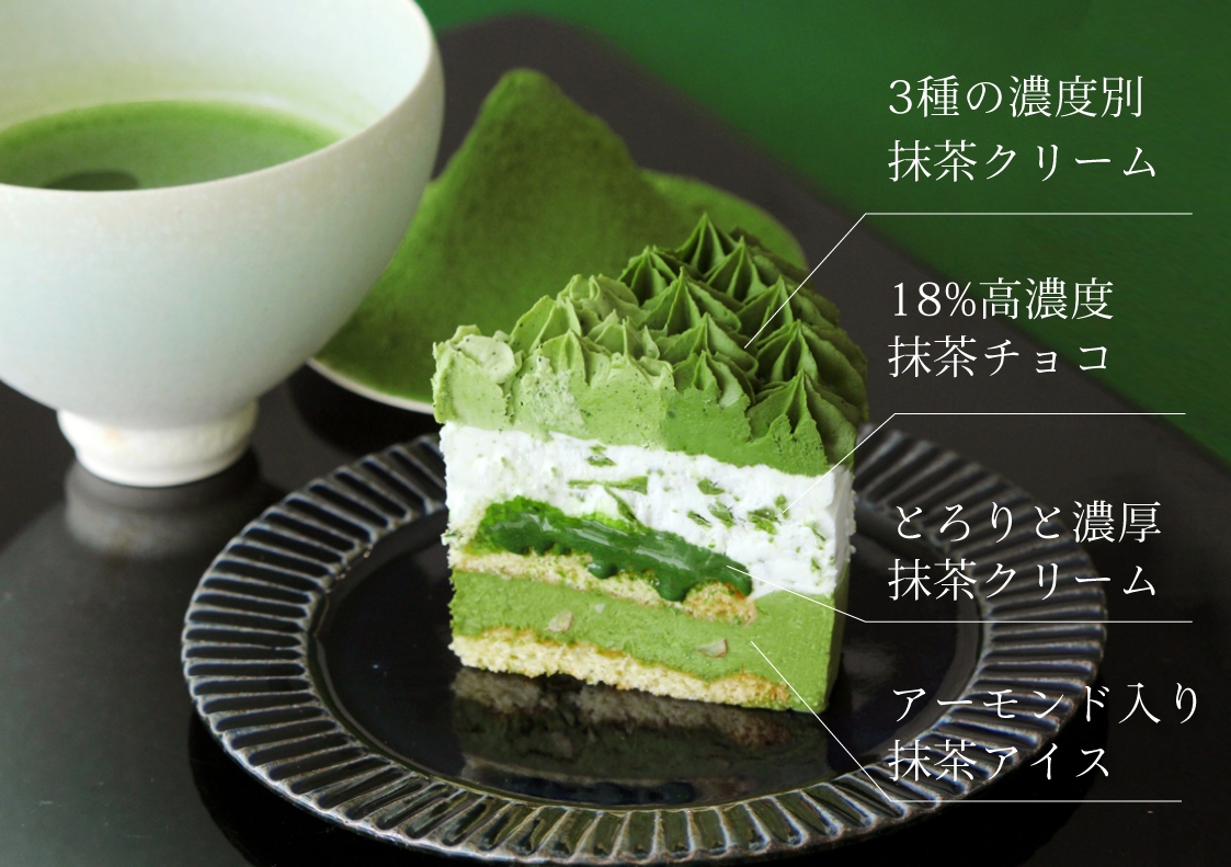 上から下まで抹茶の味わいを楽しみ尽くすことのできる構成で、抹茶の魅力を再発見できるケーキです。抹茶ファンにぜひとも食べていただきたい重厚なケーキです。