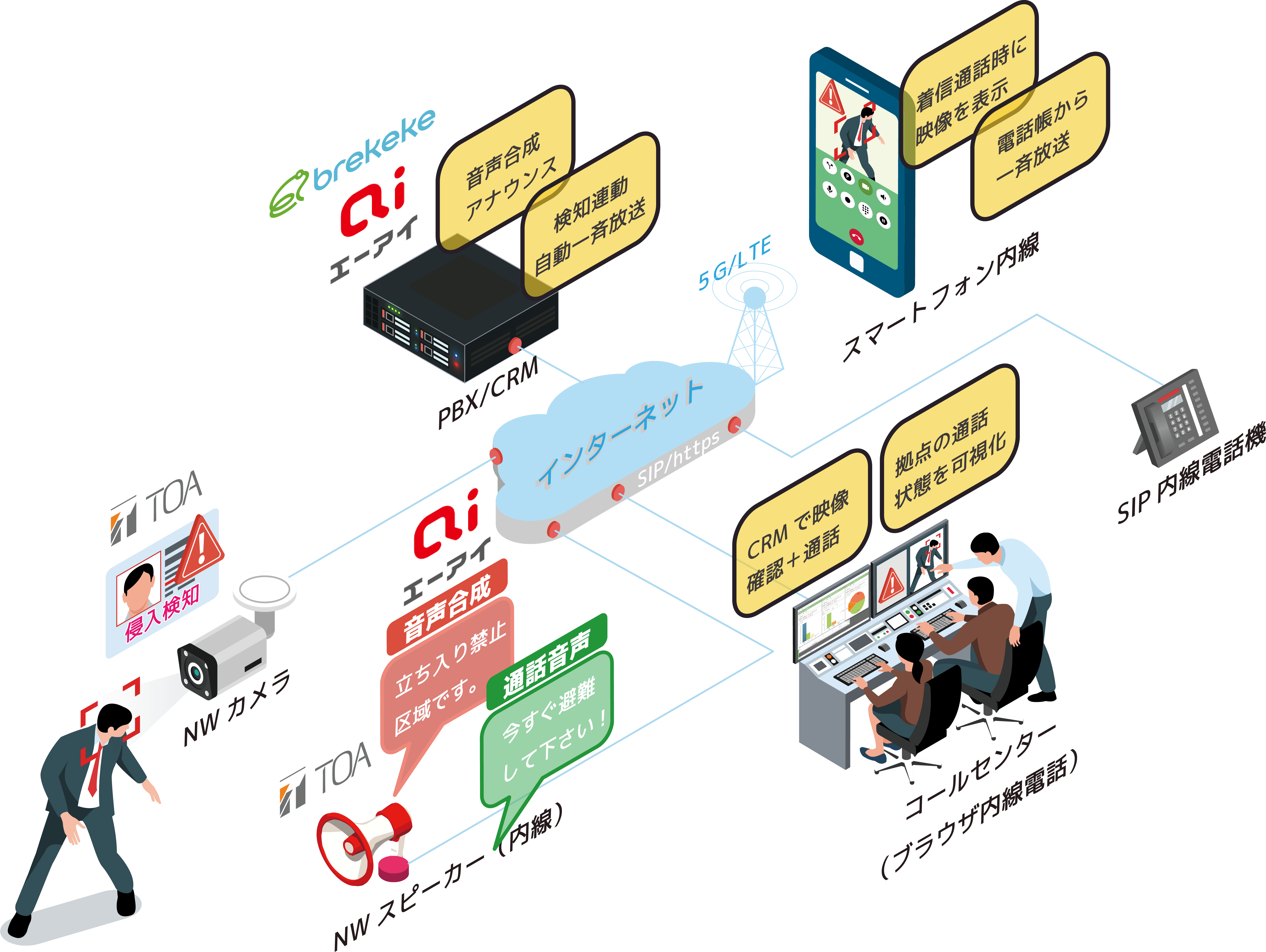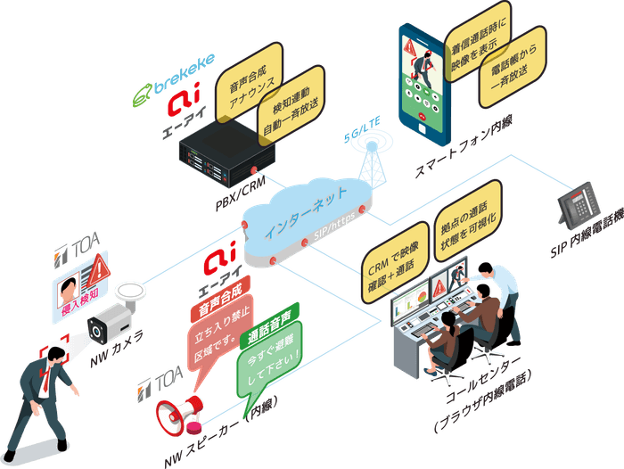 日本ブレケケが提供するBrekeke PBXにエーアイの音声合成を連携させ、TOAの提供するSIP対応IPスピーカー(IPオーディオシリーズ)から、音声情報を一斉通知または特定箇所にのみ通知など、通知先を制御して音声放送を行うことができます。さらにTOAの提供する防犯カメラ(TRIFORAシリーズ)と連携することで、滞在者数や人数カウントの検知をきっかけに、スマートフォンアプリ(Brekeke Phone)、またはコールセンター製品(WEBブラウザPhone)を使用した現地映像の確認と拡声放送、エーアイが提供する音声合成による自動放送が可能となります。