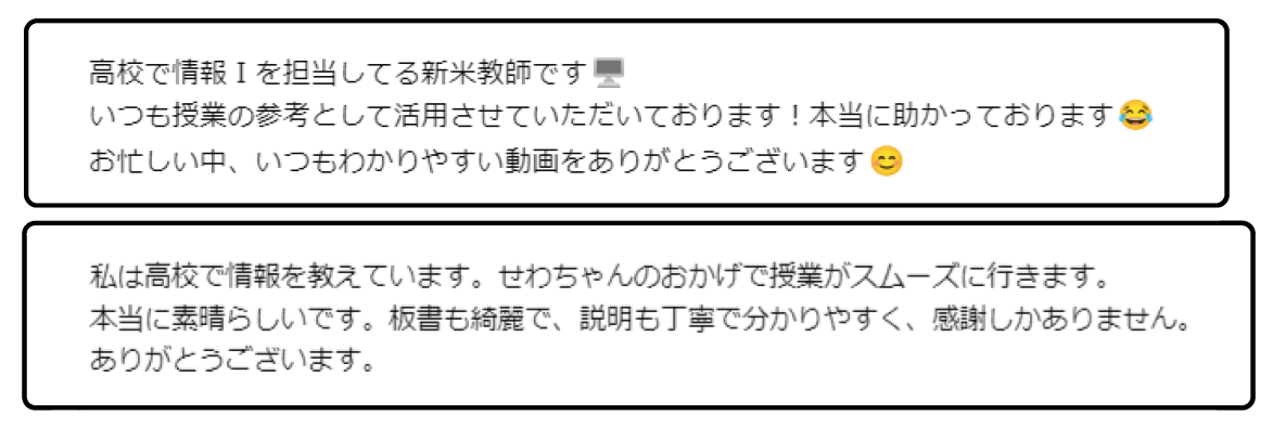 「せかチャン」運営者の菅原は東京工業大学で情報工学を履修し、大学院卒業後はIT研修講師として情報技術やプログラミングの研修を企画・実施してきました。そこで、高校生の情報学習や先生方の授業準備のお手伝いができればと思い、これまで2年間、高校情報科目の授業動画(100本以上)を制作してまいりました。