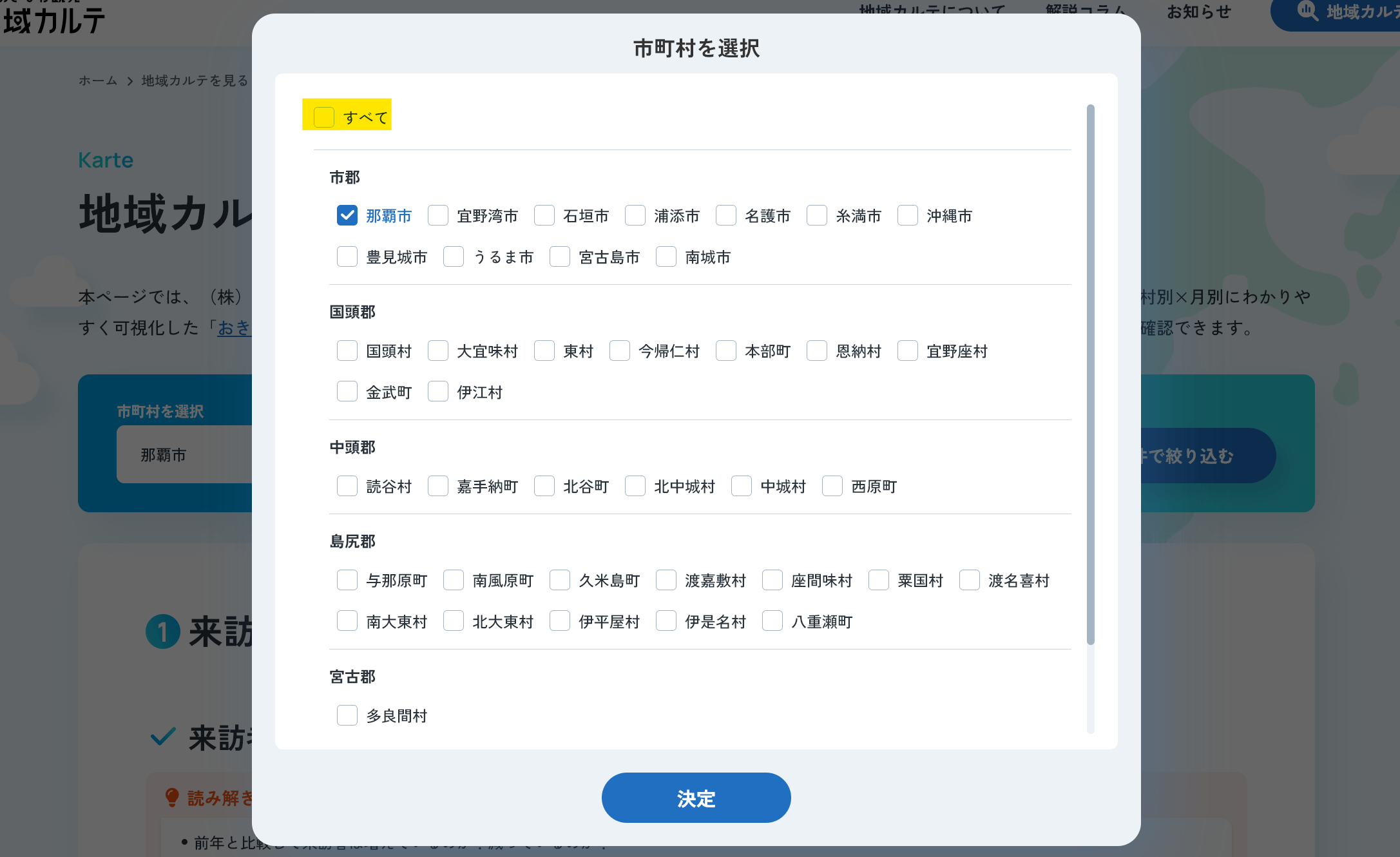 プロトタイプ版では、発地(推定居住都道府県)を県外のみに絞っていましたが、主に離島や北部地域など、県内観光客の可視化を行いたいニーズを受けて、県内も選択できるようになりました。チェックをON/OFFすることで分析対象の市町村を除くことも可能になり、自市町村以外からどれくらい来訪しているか?を知ることができます。