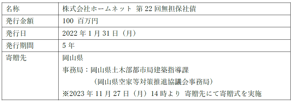 テクノロジーで気軽な住み替えをサポートする株式会社 property technologies(以下「当社」)のグループ会社である株式会社ホームネットは、株式会社中国銀行(以下「中国銀行」)を引受先とする、SDGs私募債「地域応援型」を発行し、発行手数料の一部を岡山県へ中国銀行と連名にて、岡山県の「空き家問題」の解決に向け寄付し、2023年11月27日(月)に寄贈式を行いました。