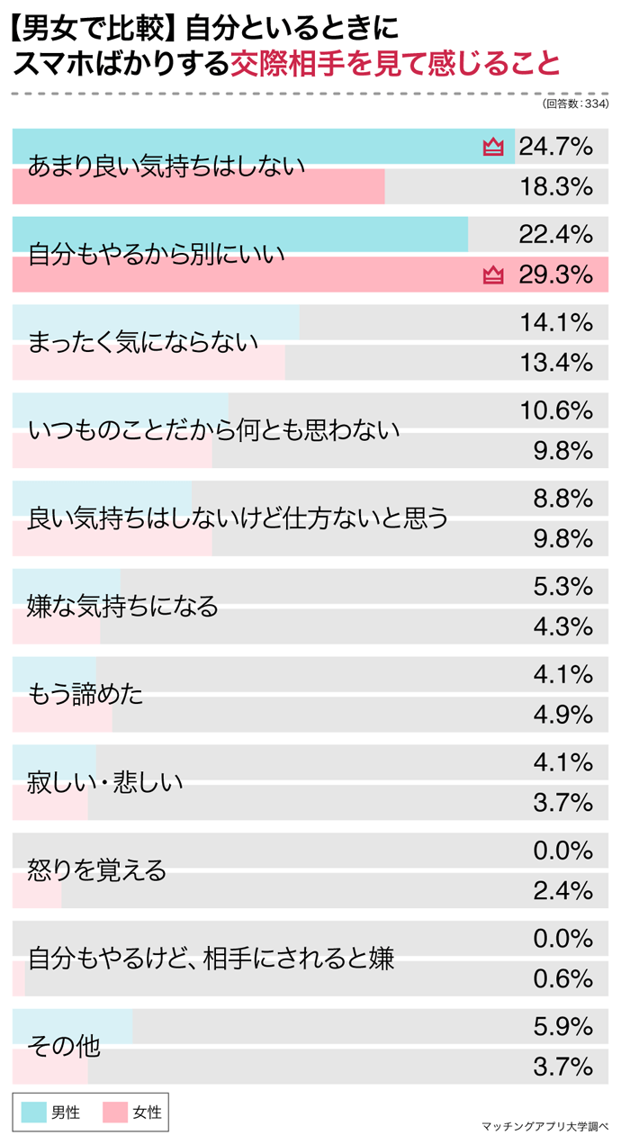 これまでは「彼氏・彼女が自分といる時間にスマホばかり見ていて悲しい」と悩んでいた人も、今回のアンケートで「交際相手が自分といる時間が楽しくないと思っているとは限らない」ということが分かったのではないでしょうか。