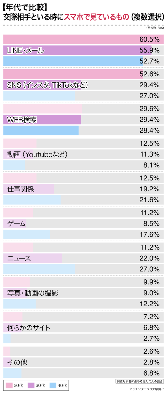 これは、デート中のスマホ利用の目的だけの問題ではなく、SNSに対する価値観が年代によって大きく異なる状況を表したものだとも言えそうです。