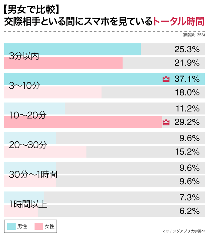 デート中のスマホ閲覧は、5割以上の男女が10分以内