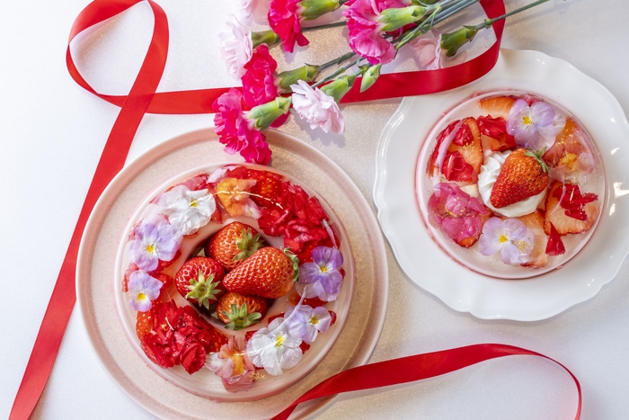 いちごのピューレをふんだんに使ったいちごババロアとミルクババロアの上には、地元伊豆の国市産のいちごと季節のエディブルフラワーを敷き詰めた3層仕立ての限定スイーツ。初夏にぴったりな涼しげな味わいで、家族で愉しむ母の日を華やかに彩ります。
