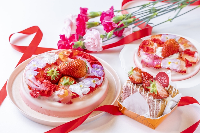 エディブルフラワーをふんだんに使用したまるで花束のような華やかないちごスイーツは、日頃の感謝を込めた贈りものにぴったりです。旬のなごりを迎える地元・伊豆の国市産のいちごを使用しました。母の日限定で、通販で全国のお客様にもお届けいたします。