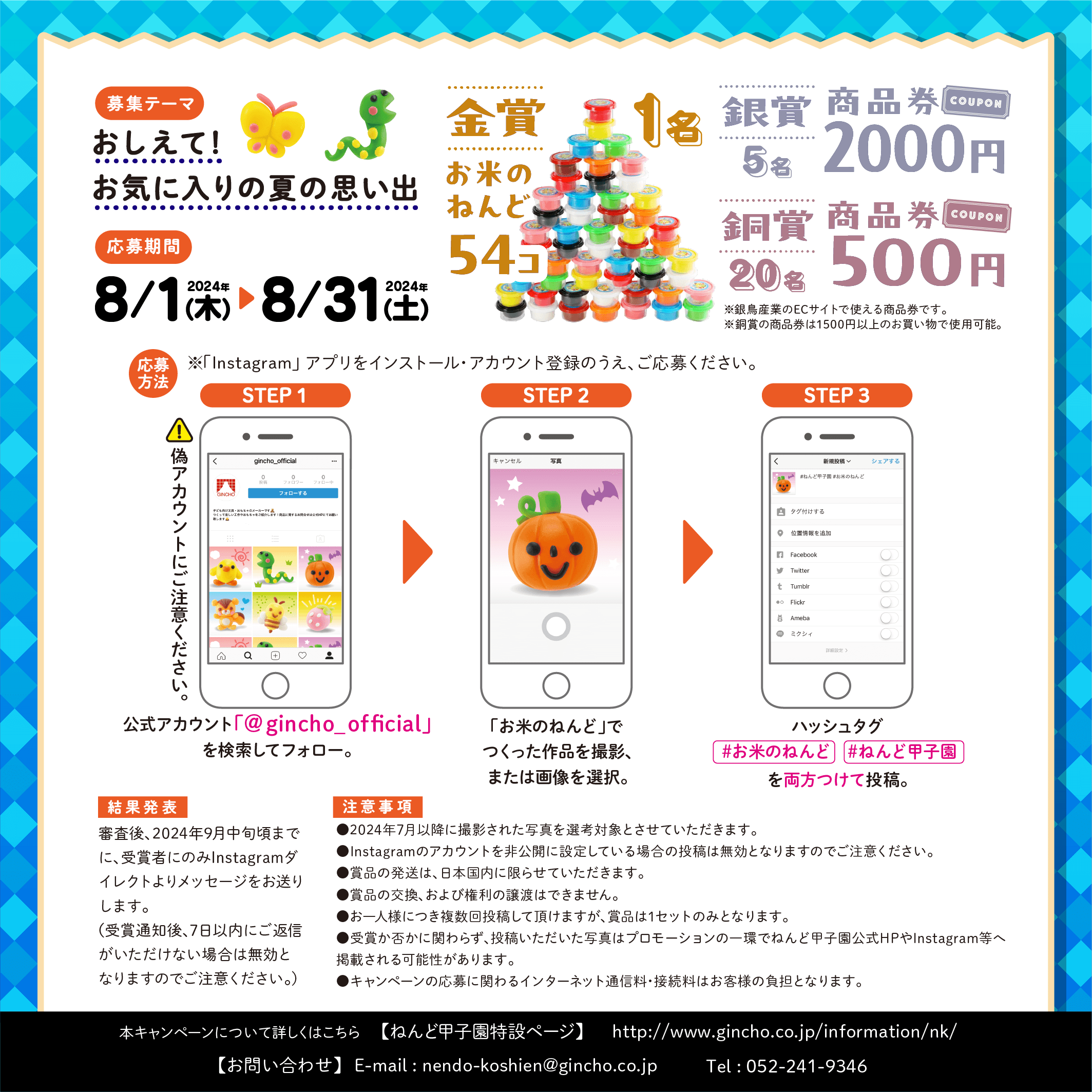 こども向け知育玩具の企画販売を行う銀鳥産業株式会社(所在地:愛知県名古屋市、代表取締役社長:西村 友秀、以下 銀鳥産業)は、2024年8月1日(木)から同8月31日(土)までの一ヶ月間、Instagramにおいて、お米のねんどで作った作品を対象にしたフォトコンテスト「第14回ねんど甲子園」を開催いたします。