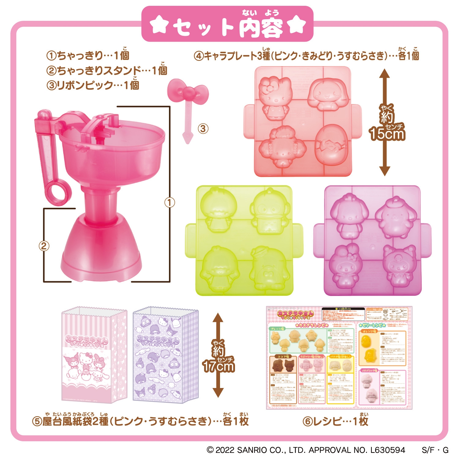 本商品は12種類のサンリオキャラクターの型(キャラプレート)や、お祭り気分を味わいながら生地をプレートに流し込める「ちゃっきり」などが付属しており、カステラをひとりで作っても、家族や友達と一緒に作っても楽しめる商品です。