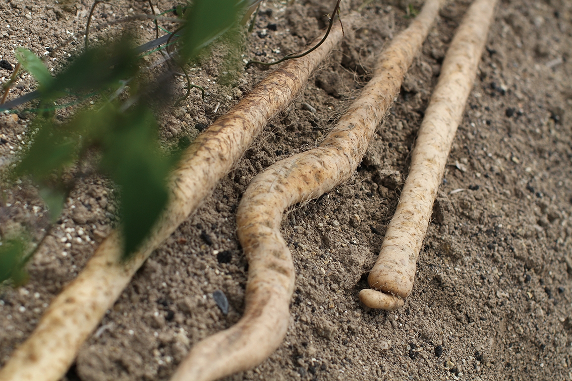 自然薯は山芋の中で、1番粘りと風味と栄養が豊富だと言われています。まっすぐで料理がしやすい自然薯づくりを長年研究し、2012年に「ほんやま式」という栽培法の特許とることができました。