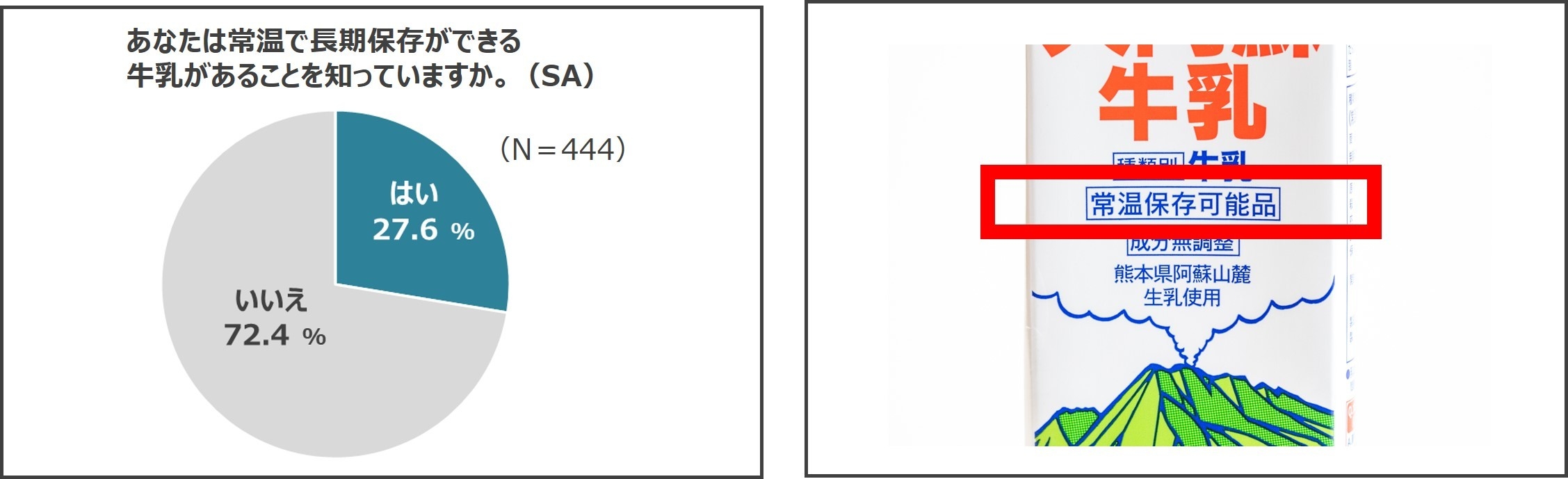 今回の調査結果で、常温で長期保存ができる牛乳があることを知っていると回答した方は27.6%でした。少しでも日持ちする牛乳を購入するために賞味期限を気にしているのであれば、ロングライフ紙パックの牛乳がおすすめです。