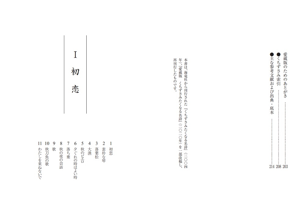 詩の題名がうろ覚えでも、詩中の印象的な一文やフレーズで詩を探すことができる「くちずさみ索引」を巻末に付しています。