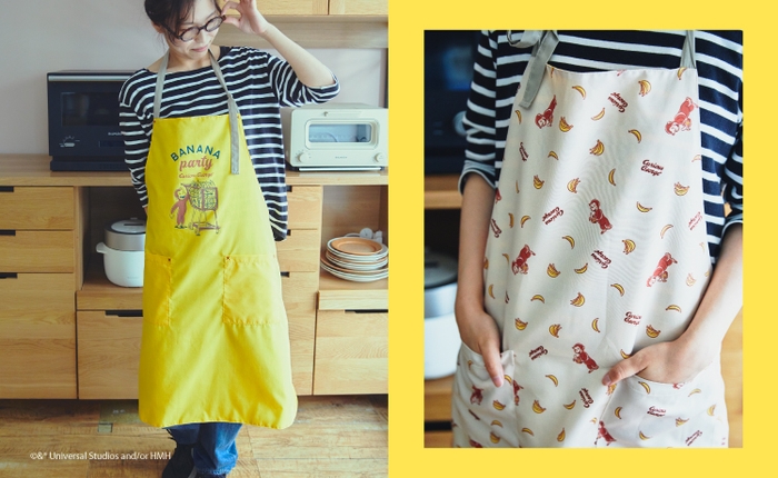 ジョージ&「Banana Party」ロゴと、総柄のリバーシブルエプロンは大人でも着やすいようシンプルなデザインに仕上げています。三角巾付きのキッズエプロン(¥2,750) もご用意していますので、夏休みにお揃いでクッキングを楽しんでみてはいかがでしょうか?夏らしい色味に大きくデザインを入れたティータオルはキッチンを明るく彩ります。また、使いやすいサイズのキッチンクロスは柔らかく手触りの良い素材で仕上げました。