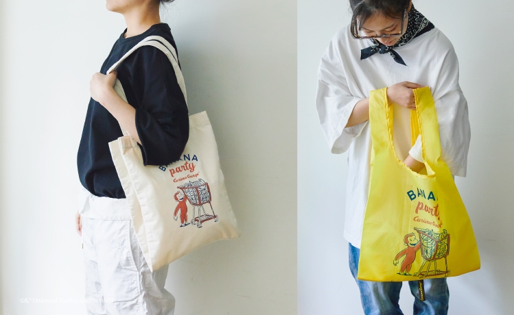 トートバッグは収納スペースが二つに分かれていて収納たっぷり!デイリーユースはもちろん、旅行先などでも活躍します。薄くて柔らかいポリエステルを使用した大きめサイズのエコバッグも、ジョージ&「Banana Party」ロゴ入りで、お買い物に行くのが楽しくなります。