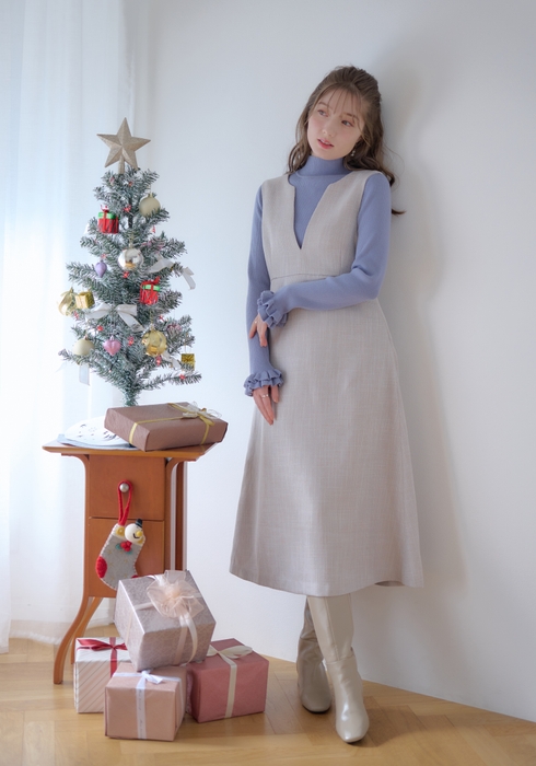 Knit ¥3,990 Jumper dress ¥7,500 Boots ¥11,000 Ring ¥1,650