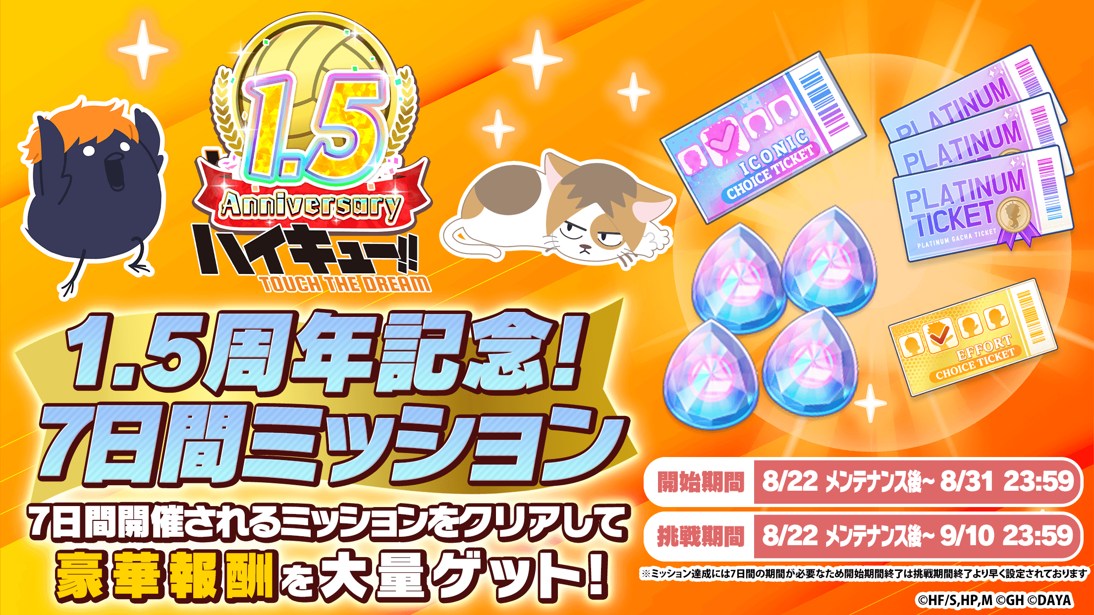 スマホゲーム『ハイキュー!! TOUCH THE DREAM』 1.5周年を記念して8月22日(木)から1.5周年キャンペーン開催 ~第3回「マネージャーの部屋」実施~