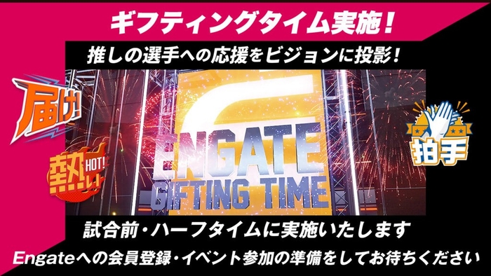 Engateは声援をチームや選手に届けるWebサービスです。設定されたイベントに参加してチームや選手に手持ちのデジタルポイントを使って応援する(ギフトを贈る、ギフティング)と、特別なグッズや体験などのさまざまな特典(リワード)を受けられます。新サービス開始記念として5月6日、25日の試合で来場者限定イベントを開催し、プレーオフを控えた今季最後のホーム戦となる二試合を盛り上げます。