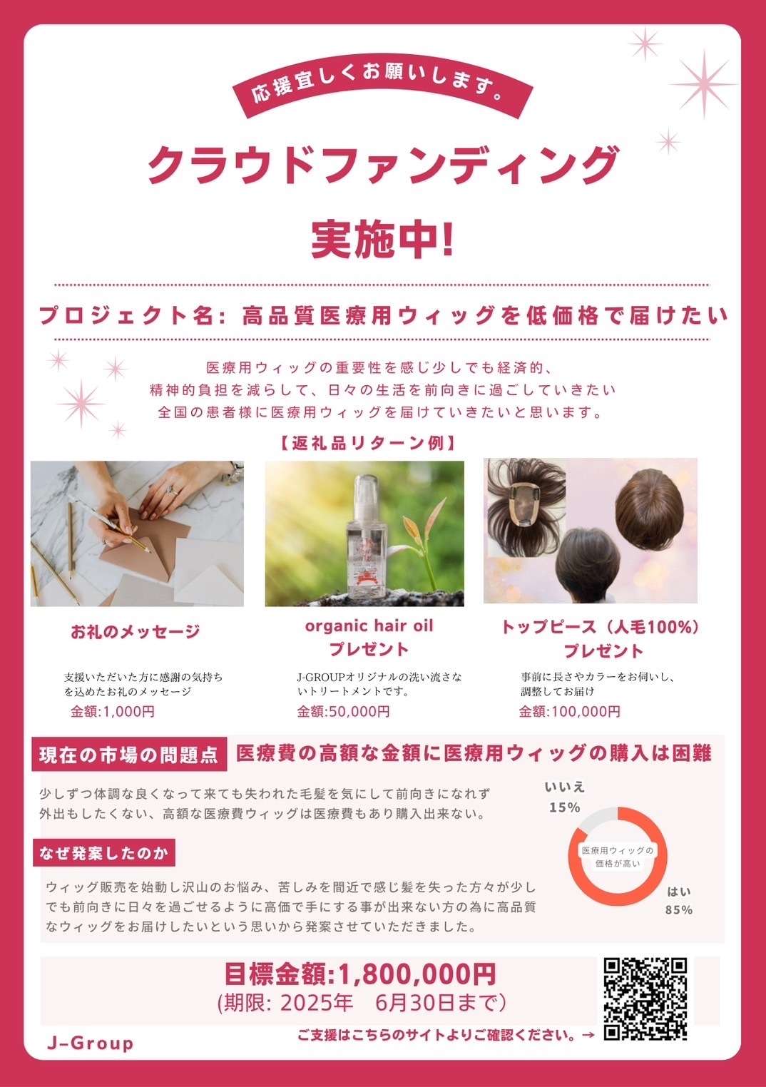 美容室で医療用ウィッグなどの提供を行う株式会社ジェイは、高品質な人毛100%の医療用ウィッグを、全国の提携美容室と連携して低価格で提供するプロジェクトを、クラウドファンディングサイト「CAMPFIRE」にて2025年5月2日に開始、6月30日まで実施いたします。